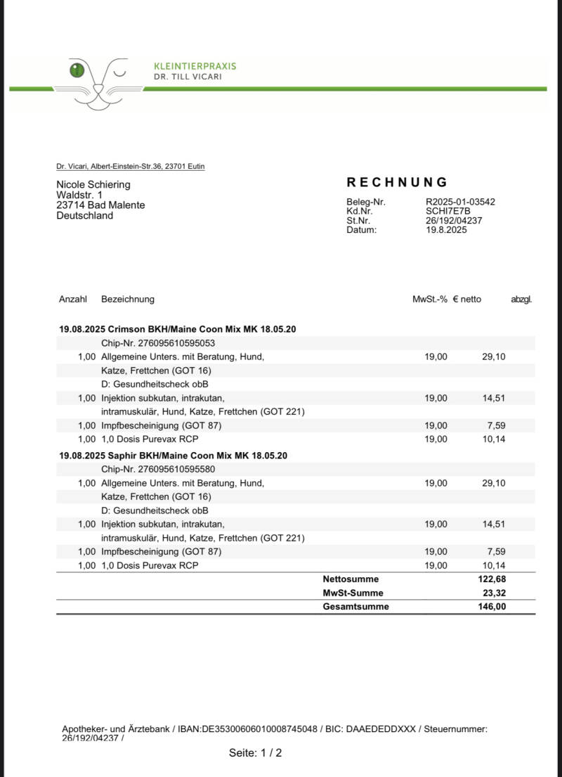 Jährlicher Check-Up inklusive Impfung. Beide sind bis auf ein wenig Zahnstein an den hinteren Zähnen, welcher vor Ort direkt erfolgreich entfernt wurde, maunzmunter. Kostenfaktor heute: 146,00€