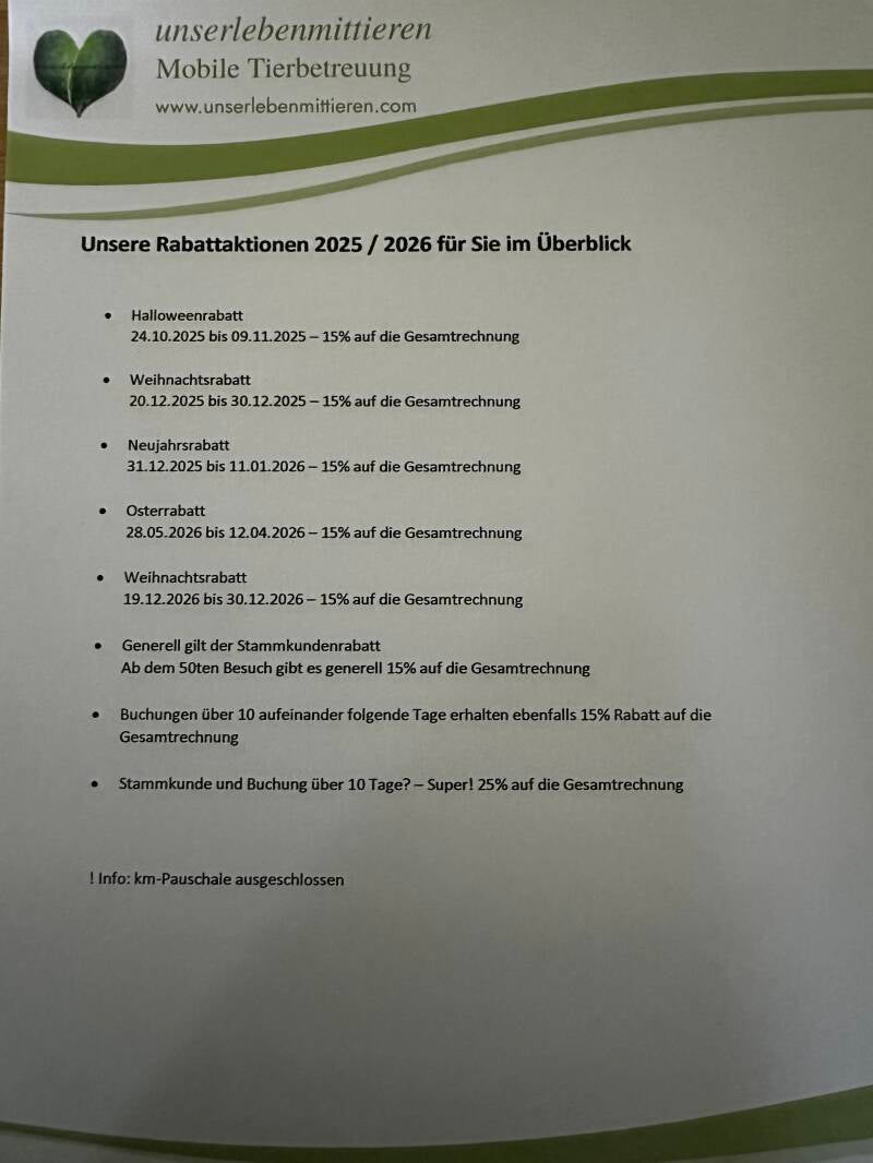 Solltest du als Stammkunde den Zeitraum über 10 Tage in Anspruch nehmen, gibt es 25% auf die Gesamtrechnung.